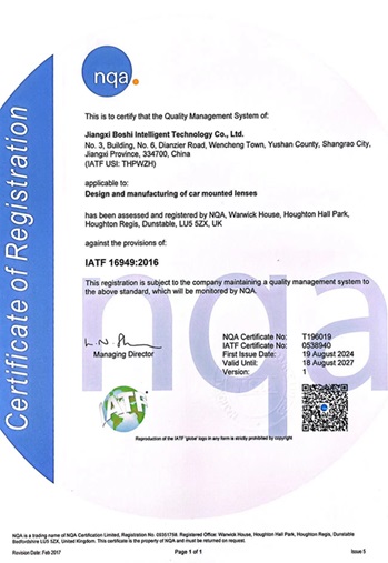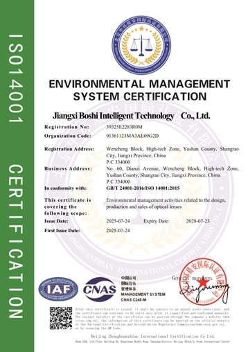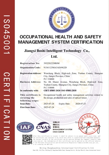 Это означает, что Baoshi Intelligence создала стандартизированную систему управления, охватывающую всю цепочку исследований и разработок оптических линз, производства, продаж и послепродажного обслуживания, закладывая прочную основу для непрерывного предоставления высококачественных продуктов и услуг.